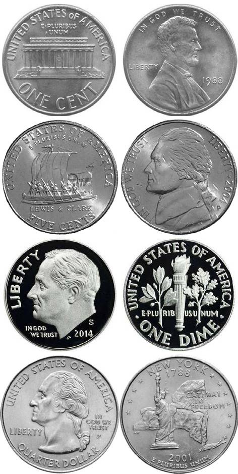 «пенни», 5 – «никл», 10 – «дайм», 25 – «квото», пятьдесят центов – «полдоллара».