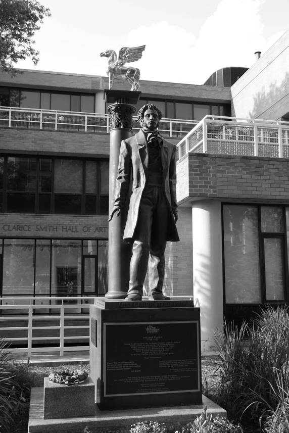 По сложившейся традиции, где бы я ни бывал, если в той местности имеется памятник Пушкину, я обязательно найду время прийти и поклониться Александру Серге- евичу. Так случилось и в столице Америки. Вашингтон находится на границе со штатом Вирджиния, где мы про- живали, поэтому один из вечеров был специально посвя- щён поездке к Пушкину. Интернет выдал точный маршрут движения, и мы довольно-таки быстро оказались на месте. В одном из тихих двориков на территории университета имени Джорджа Вашингтона в 2000 году был возведен красивый монумент – дар московской мэрии американ- ской столице. Трехметровый Александр Пушкин стоит на мраморном постаменте, а над ним, расправив крылья, сверкает позолотой мифологический конь Пегас, символ поэтического вдохновения. Памятник красивый, правда стоит он в тесном скверике и впритык к одному из корпу- сов университета. И если взглянуть на памятник справа, то нельзя не обратить внимания, что на его фоне взметнулась на восемь этажей вверх открытая парковка автомобилей. Все это, конечно, мелочи. Главное: зимой и летом у под- ножия памятника – цветы. Помнят и чтят поэта и в столь далёком зарубежье. Этот торжественно-праздничный па- мятник вполне соответствует столичной высокопарности. И подтверждение тому не только позолоченный крылатый