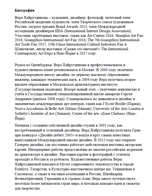 Напишите резюме с информацией о месте учебы, работы, о выставках, с указанием времени, места и названия. Используйте только ту информацию, которая в данном случае подходит к вашей творческой сфере деятельности. Наверняка вы участвовали в групповых выставках, мероприятиях.