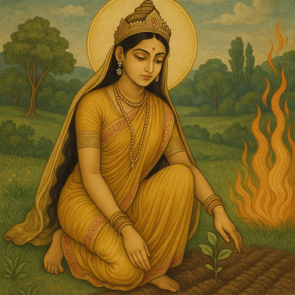 Однажды, вспахивая землю во время обряда, он обнаружил в борозде младенца. Малышка сияла, словно сама богиня Лакшми сошла на землю. Царь понял: это не обычный ребёнок. Он назвал её Ситой – ведь она была найдена в борозде (на санскрите «сита» означает «плуг»).