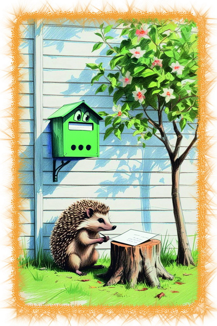 Всё началось с почтового ящика. День, когда на солнечную сторону летнего дома повесили почтовый ящик, был первым днём лета. Дом выглядел нарядно – белые стены и зелёная крыша. И ящик тоже был зелёный. Он очень красиво смотрелся на белой стене. А рядом росла яблоня. Ей в среду исполнилось пятьдесят лет. Верхушка яблони подпирала небо. Во всяком случае, ёжику по имени Жора Иголкин так казалось.