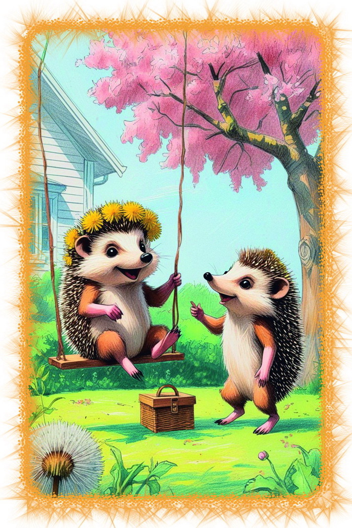 На лужайке около дома Иголкиных скрипели качели. Сестра Ежина сидела на них с книжкой. Жора решил подкрасться и напугать. Когда он был уже рядом, Ежина резко повернулась и захохотала.