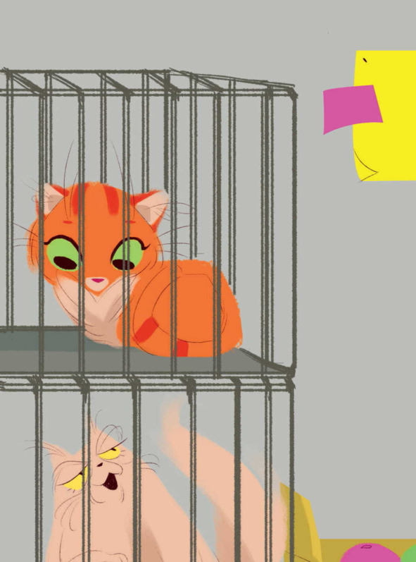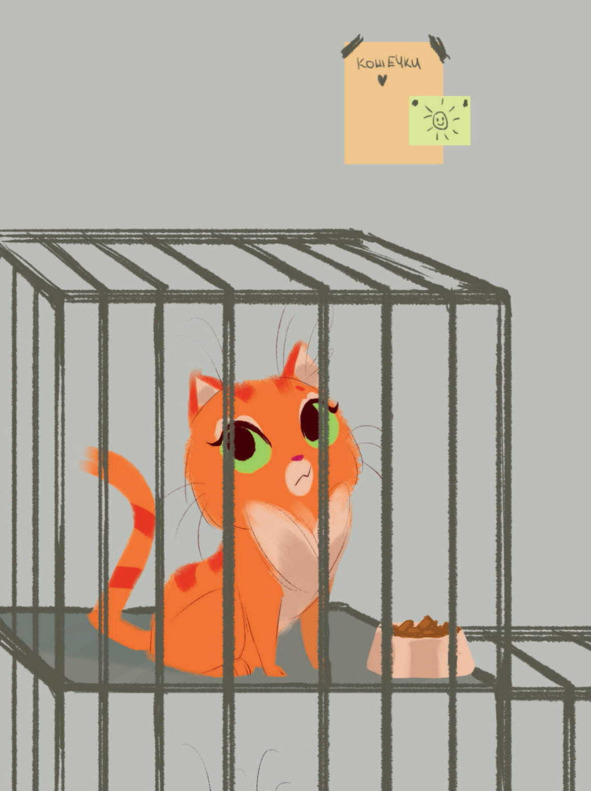Солнышко очнулась в каком-то очень красочном помещении. Ничего больше не плясало и не кружилось. Кошка подтянулась и ее лапы упёрлись в что-то твёрдое. Она поднялась. Оказывается, Солнышко была заперта в небольшой коробочке, сделанной из очень прочных прутиков. На полу стояла какая-то чаша с непонятным месивом из сухарей и какой-то жижи. Солнышко вспомнила о голоде и с жадностью съела всё из блюдечка и стала осматриваться. Вокруг плотными рядами стояли точь-в-точь такие же коробочки. И в каждой из них сидели коты.