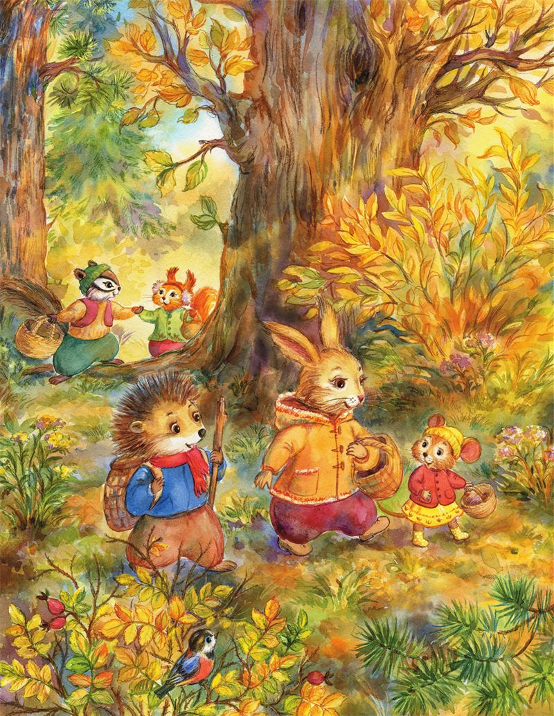 Осень в сказочном лесу выдалась необычайно красивой. Укромная полянка в глубине чащи была покрыта жёлто-красным ковром из листьев. День стоял тёплый и солнечный. С самого начала осени зайка Лёля, белочка Зося, мышка Соня, ёжик Сеня, бурундучок Феня и маленький барсук Боря делали запасы на зиму.