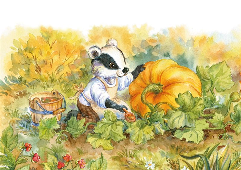 Барсук Боря каждый день готовил секретное удобрение и подкармливал тыкву, отчего она становилась всё шире и шире.