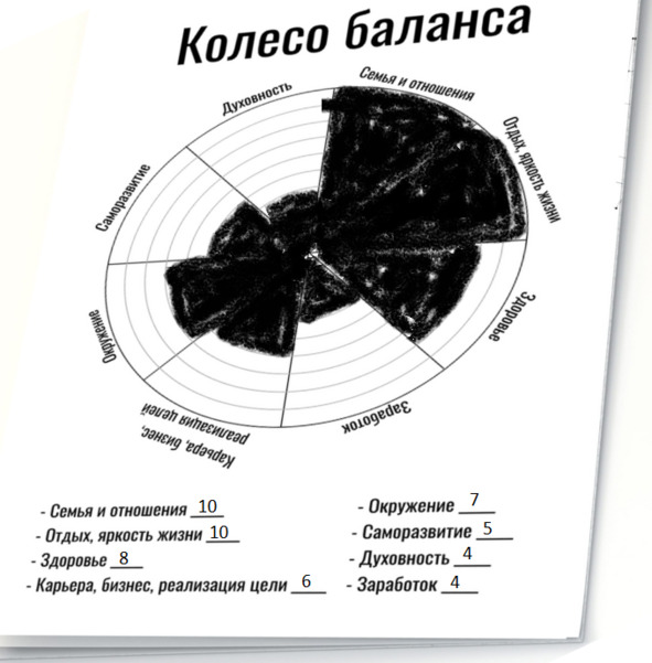 – Смотри. Есть основополагающие сферы Жизни, в которых, в идеале, должна быть гармония. Но чаще всего они не идут вровень. И когда ты рисуешь такое колесо, ты можешь увидеть, где именно провалы. Понимаешь?