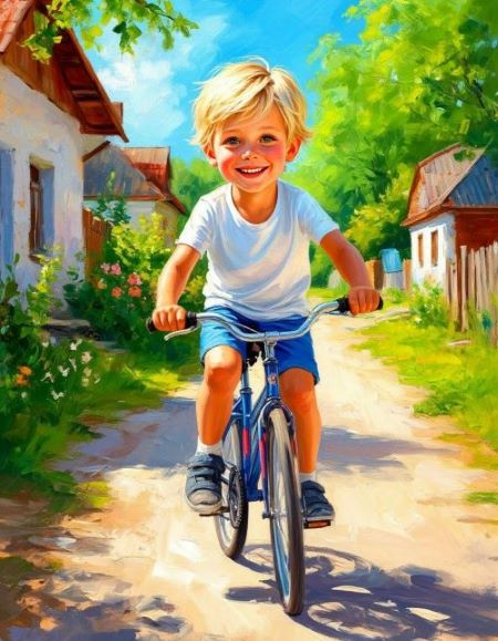 Подул сильный ветер. Набежали черничные тучи. Дождь, как весёлый барабанщик застучал своими хрустальными палочками-струями по крышам домов, по спинам ребят, мчащихся наперегонки домой. Среди них был и Ванька. Вот знакомая калитка. Ванька скрипнул её дверью и бросил велосипед под куст сирени. Несколько шагов-прыжков через пузырящиеся лужи, и он под крышей бабушкиного крыльца. Разлившийся по дому запах блинов поманил Ваньку на кухню.