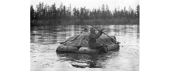 Интересна конструкция его сплавного сооружения: катамаран из двух 500-к он поставил на плот из сухих досок, к которому приделал четыре полоза-салазки (как санки). Понтоны жестко прикрепил к плоту. Таким образом увеличилась загрузка лодок, а их днища были надежно защищены от порезов на перекатах. Сооружение, конечно, довольно тяжелое и не очень хорошее для мелких рек с перекатами, но довольно остойчивое и удобное для рек с глубокими плесами.