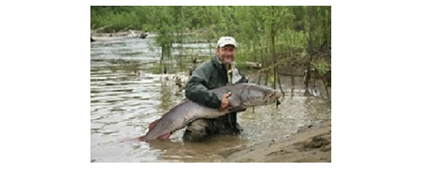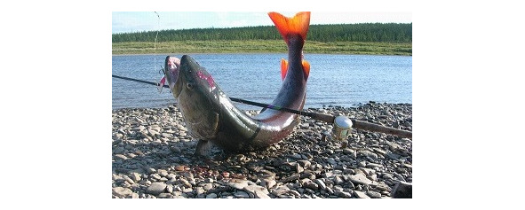 Первый заброс… и он выволок на берег здоровенного тайменя, килограммов на двадцать.