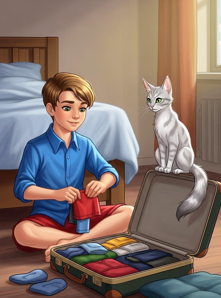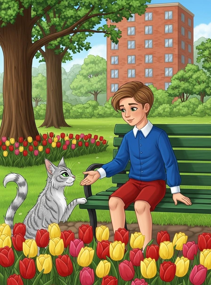 Однажды, когда Шмулик сидел на скамейке, любуясь тюльпанами, он заметил что-то необычное. Из-под куста выглянула пара больших зеленых глаз. Это была абиссинская кошка, с серебристой шерстью и пушистым хвостом.