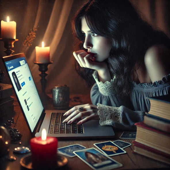 Эллаида уютно устроилась в своём небольшом, но атмосферном уголке. Комната была наполнена тёплым светом от гирлянды, развешанной вдоль полок с книгами и ароматными свечами. Деревянный стол у окна, заваленный блокнотами, картами Таро и чашкой уже остывшего чая, был её рабочей зоной. На подоконнике стояли несколько горшков с растениями – зелёные листья мягко шевелились в потоке воздуха от приоткрытого окна.