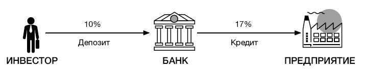 Это еще один пример инвестиций. Прежде чем разбираться в том, как работает такой инструмент получения прибыли, давайте выясним, как мы зарабатываем на банковских депозитах. Когда мы кладем на них деньги, то банк не хранит их у себя, а тут же отдает кому-то в кредит. Это работает следующим образом: банк берет у нас 100 тысяч рублей под ставку, например, 10 %, далее отдает эти деньги какому-нибудь предприятию на развитие в виде кредита под 17 %. 10 % из полученной прибыли он вернет нам, а 7 % оставит себе, и это пойдет на покрытие затрат (многочисленный персонал, реклама, красивые офисы, обслуживание банкоматов и так далее). Часть средств также останется в качестве прибыли банка [4].