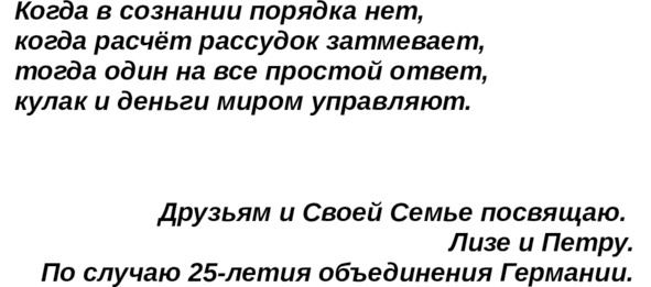 Я не для этого ее родила в Германии. После развала СССР казалось, что страшнее ничего не могло случиться. Однако, я ошиблась. Настоящая беда настигла самую развитую в Европе Страну. И никто не хочет спасти Германию. Никто. То, что здесь происходит терпеть нельзя. Немецкому правительству надоели немцы. Нужно принимать меры. К сожалению, я не могу взять в руки оружие. Я решила попробовать бороться пером. Все происходящее в ФРГ сегодня, было запрограммировано. Великая Отечественная Война. Великий Немецкий Народ расплачивается по сей день.