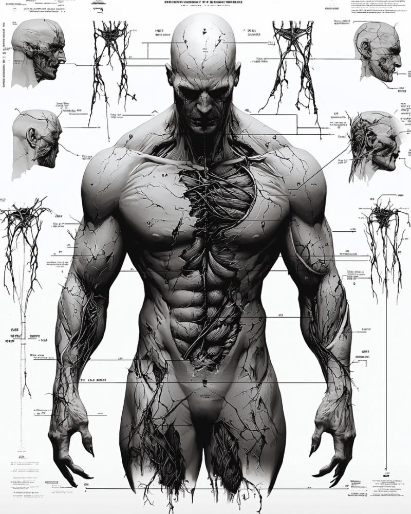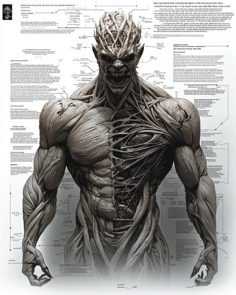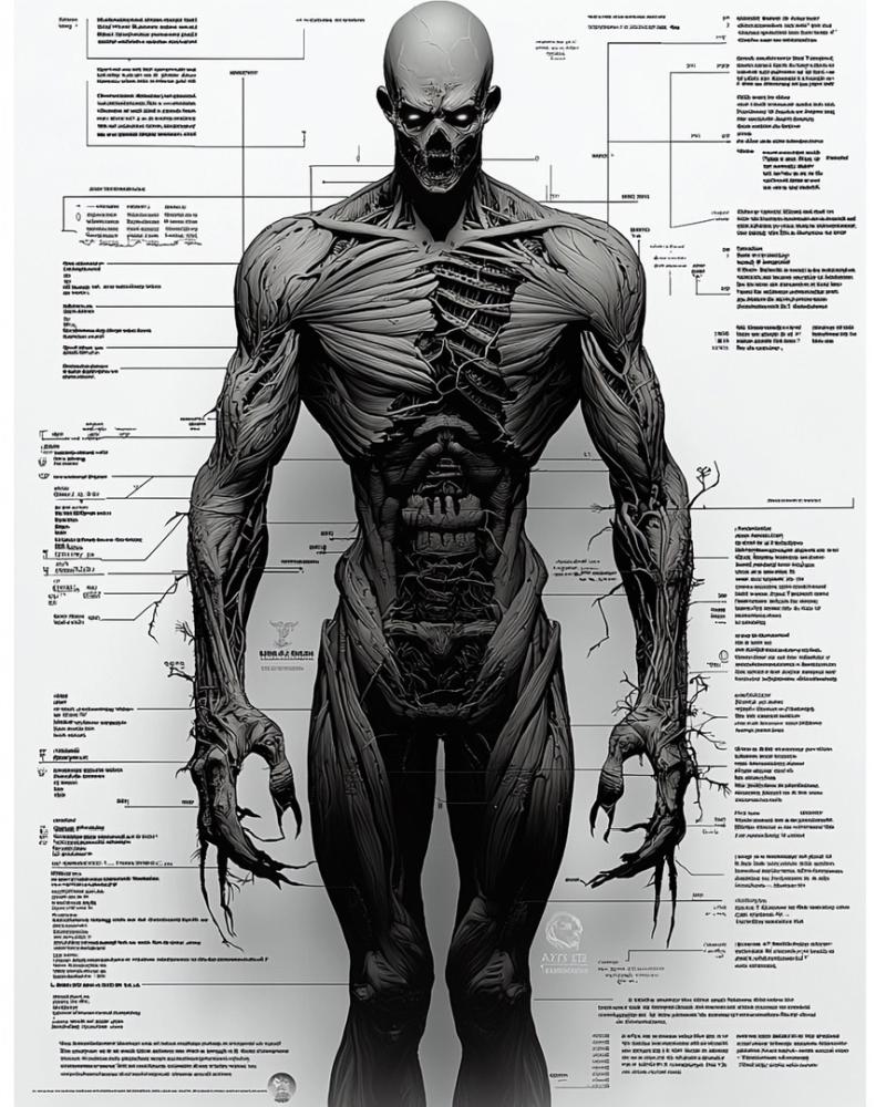 На дисплее высвечивается фигура, словно вырванная из самых мрачных глубин нашего сознания. Это существо – пугающий гибрид человека и зверя, искажённый до неузнаваемости под воздействием мутаций. Его тело, будто выкопанное из подземного мира, кажется выжженным и разрушенным временем, но несмотря на видимый ущерб от последствий вируса – оно все еще живо. Бледная, мёртвая кожа, покрытая трещинами, рубцами и наростами; на мощных мускулах выпирают вздутые вены, движения замедленные и зловещие. Тяжёлая челюсть, снабжённая зубами, четко очерченная, как обломок скалы. Глаза – чёрные провалы с желтыми радужками и пульсирующими вертикальными зрачками, лишены всего человеческого, в них не отражаются страх или колебание, а только вечная, ненасытная жажда. Этот монстр не просто убивает – он существует ради пожирания, уничтожения всего живого на своём пути.