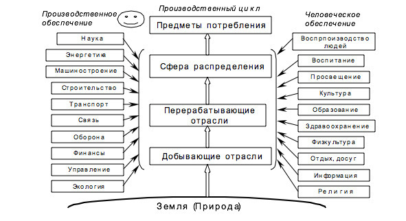 Но только этим характер производства предметов потребления не ограничивается. Для эффективной работы всего описанного комплекса требуется использовать также Производственные факторы обеспечения труда. А именно, нужно развивать науку, которая расширяет возможности человека и устанавливает наилучшие способы реализации природного потенциала. Производственный процесс следует обеспечивать энергией (энергетика), воспроизводить средства производства, т.е. строить машины и внедрять технологии (машиностроение). Требуется осуществлять строительство производственных помещений, дорог и коммуникаций, развивать транспорт и средства связи. Защищать от агрессии соседей и от некоторых собственных граждан (правоохранительные органы, оборона). Скоординированной работе этого сложного организма разделения труда содействуют финансы, торговля, обеспечивающие товарообмен хозяйственных субъектов. Весь описанный процесс не может продуктивно работать без разумного управления. При этом должны претворяться в жизнь меры, способствующие сохранению ареала проживания человечества (экология).