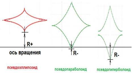 Все псевдоповерхности 2-го порядка строятся по единой схеме. Берется базовый профиль (например, параболический, гиперболический, эллиптический, круглый). Он зеркально копируется и может раздвигаться на некоторое расстояние по оси фокусов. Полученная фигура вращается вокруг новой оси, параллельной оси фокусов и смещенной на R. Таким образом формируются псевдоповерхности второго порядка.