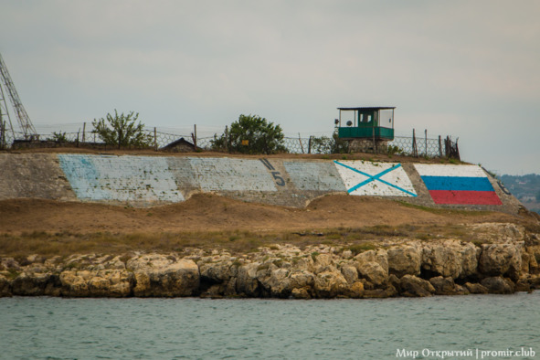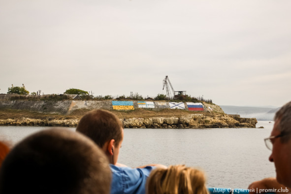Мы договорились, что встретимся в городе. Я добрался из Евпатории на северную сторону Севастополя. Город разделён Севастопольской бухтой на две части. И чтобы попасть в центр мне нужно было сесть на катер и перебраться на противоположную сторону. Это своего рода ритуал, когда в старую часть города попадаешь по водной глади. После отправления на катере проплываешь военную часть, которая находится на возвышении скальной породы. На вымощенной каменными блоками стене в этот раз виднелось всего два нарисованных флага: Андреевский и государственный флаг России. Флаги Украины были закрашены серой краской. Также было закрашено и слово «МИР», которое ранее находилось между флагами двух держав.