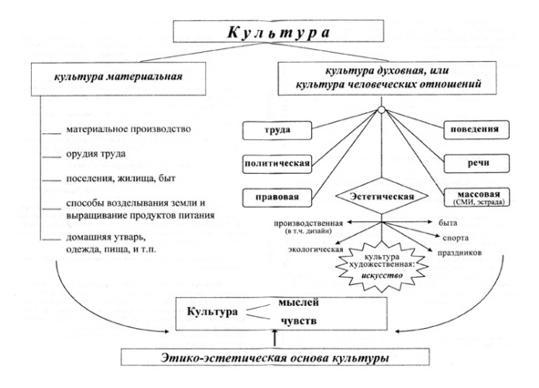 – Духовная культура – это сфера человеческой деятельности, охватывающая различные стороны духовной жизни человека и общества. Это совокупность духовных ценностей и творческой деятельности по их производству, освоению и применению. К ней относятся наука, искусство, религия, мораль, политика, право и другие сферы