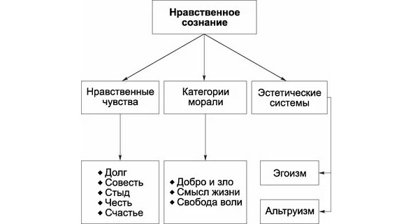 Нравственное сознание – осознание личностью норм нравственности поведения и взаимоотношений в обществе, идей, представлений, идеалов, функционирующих в обществе, а также совокупность этических знаний, убеждений, чувств, потребностей.