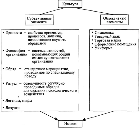 – Субъективные элементы организационной культуры – это разделяемые персоналом организации образцы предположений, верования и ожидания, сформированные на базе ценностей, а также морально —нравственные нормы и правила поведения, существующие в организации вне личности. Сюда также включают ряд элементов «символики» организации: мифы, истории об организации, ее лидерах, героях, обряды и ритуалы, язык общения и лозунги, организационные табу.