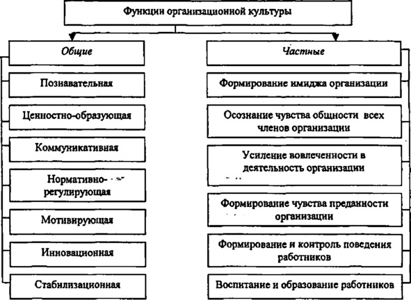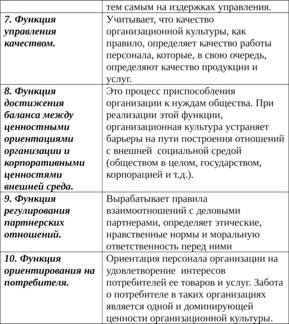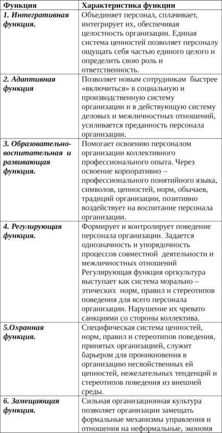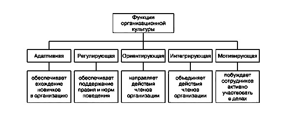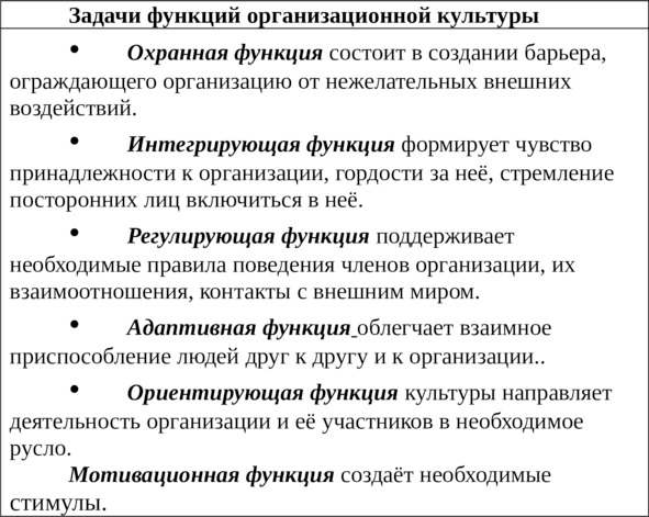 Организационная культура выполняет следующие функции: охранная; интегрирующая; регулирующая; адаптивная; ориентирующая; мотивационная; формирования имиджа.