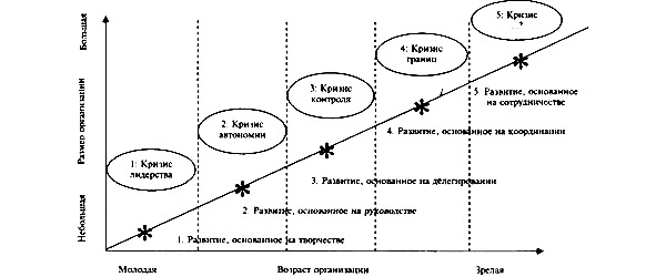 Каждая стадия развития организации характеризуется доминирующим стилем управления, а каждый революционный период – доминирующей проблемой управления, которая должна быть решена до того, как рост может быть продолжен.