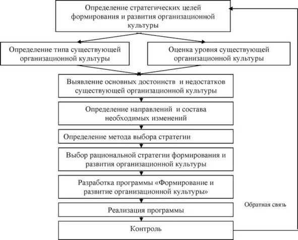 Формирование организационной культуры организации— это процесс установления определенной совокупности ценностей, норм, правил поведения, а также образов и внешних атрибутов проявления организационной куль туры, оказывающих воздействие на регулирование системы социально – трудовых отношений, их внедрения и закрепления.