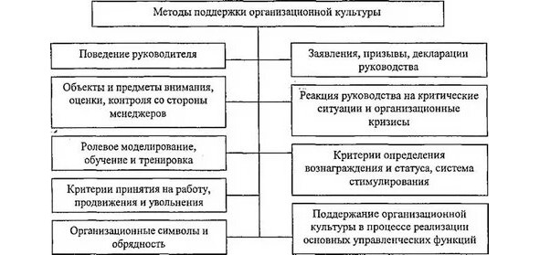 Формирование и поддержание культуры организации осуществляется с помощью таких мер, как контроль за состоянием организационной культуры, пропаганды и обучения персонала необходимым навыкам, подбору и аттестации кадров, соответствующих данной культуре, использование языка, символики, традиций, обрядов и ритуалов.