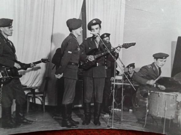 В десятом классе я играл уже на электрогитаре. Это была тоника светлозелёного цвета. Папа работал в СНИИЛПе (свердл. Научно исследов. Институ лесной пром.). Там в клубе были инструменты. В соседнем доме жил Миша Зорин. Он пригласил меня в ансамбль какой-то организации. В то время было традиционно, что всякая уважающая себя контора имела свой ансамбль (ВИА), который регулярно выступал на танцах, концертах, конкурсах. Самодеятельность называлось. Вот в такой ВИА я и попал, будучи ещё школьником. Там играли уже взрослые парни 25—30 лет. Я играл на соло гитаре. До сих пор помню одну инструментовочку. Голубая звезда называлась. Как-то раз мы отыграли свадьбу, и я получил 10 рублей. Это были первые деньги, заработанные игрой на гитаре.