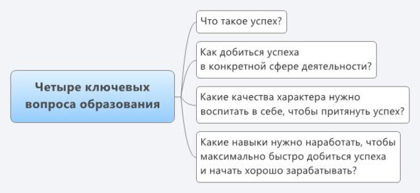 5. Смысл образования – не напичкать вас информацией, а научить правильно действовать и дать ответы на четыре ключевых вопроса: что такое успех, как добиться успеха, как воспитать в себе соответствующие качества характера и какие навыки наработать, чтобы начать хорошо зарабатывать.