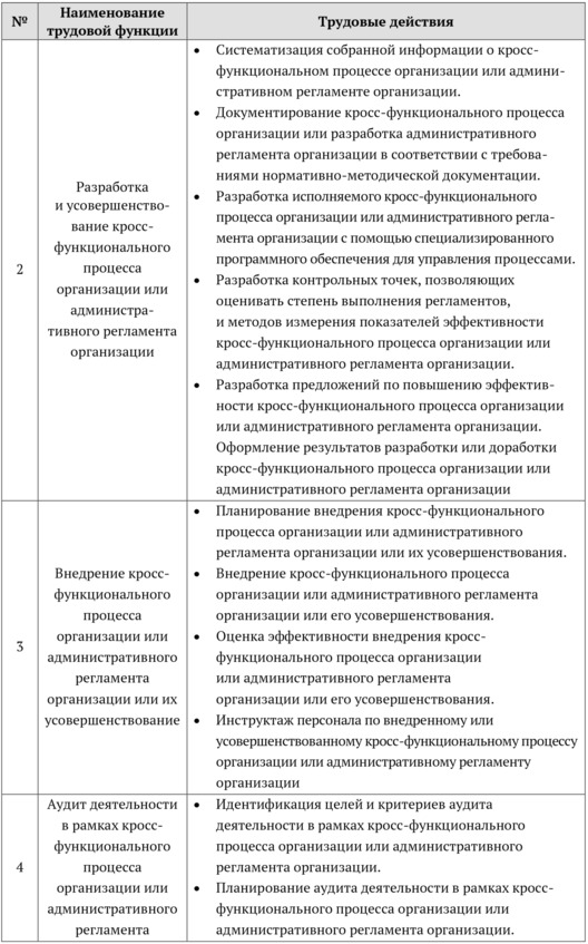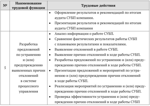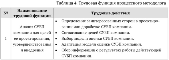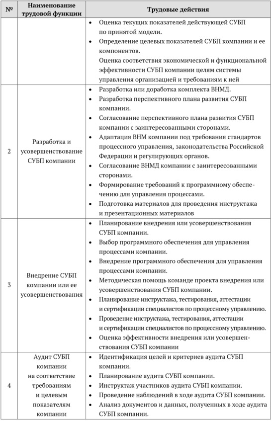 В соответствии с профессиональным стандартом «Специалист по процессному управлению» №1138 (утвержден приказом Министерства труда и социальной защиты РФ от 17 апреля 2018 г. №248н) процессный методолог в рамках обобщенной трудовой функции «Проектирование и внедрение СУБП компании» выполняет следующие трудовые функции.