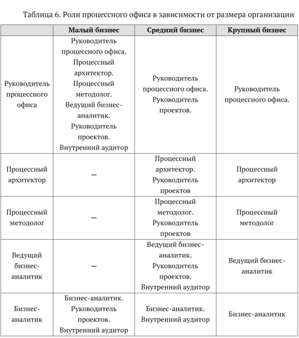 В таблице 6 показано, какие роли могут играть сотрудники процессного офиса в зависимости от размера компании.