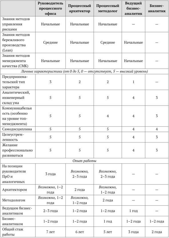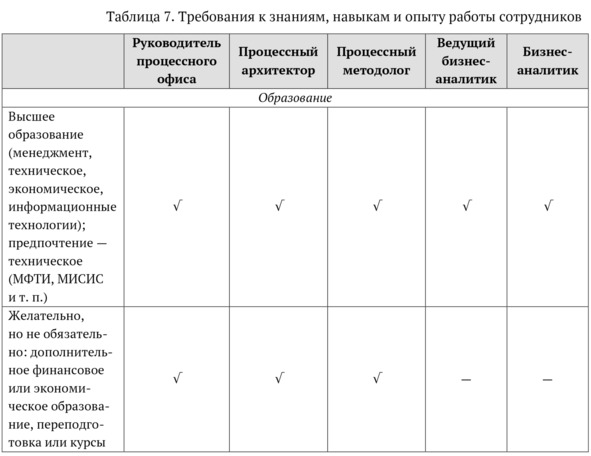 В данном разделе я предлагаю вашему вниманию рассмотреть требования к образованию, знаниям, навыкам, личным характеристикам и опыту работы сотрудников процессного офиса – см. таблицу 7. Понятно, что придется брать тех кандидатов, которых вы сможете найти в вашем городе или заманить переездом. В ряде случаев возможна дистанционная работа, но для внедрения технологий процессного управления очень важно личное присутствие и коммуникации с работниками компании. В таблице 7 представлена в каком-то смысле идеальная ситуация, к которой можно стремиться.