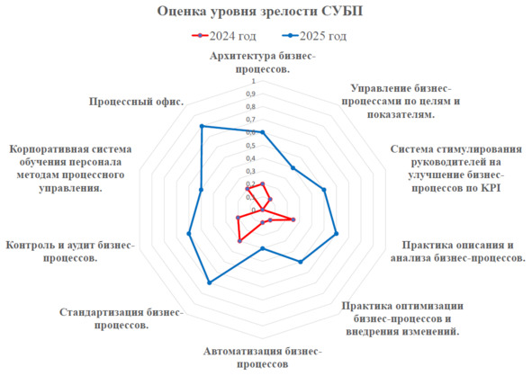 На рис. 7 показан пример оценки уровня зрелости СУБП компании7 за 2024 год (старт проекта внедрения СУБП) и план на 2025 год.