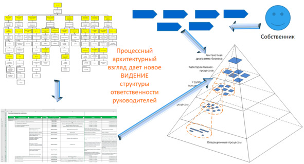 Организационно-штатная структура компании – объективная реальность. Понимание процессов, выполняемых в структурных подразделениях («Экселька»), – исходные данные, «руда», сырье для процессной модели. Видение собственника «с высоты птичьего полета» – основа для понимания цепочек создания ценности (базовых бизнес-компетенций, бизнес-модели организации).