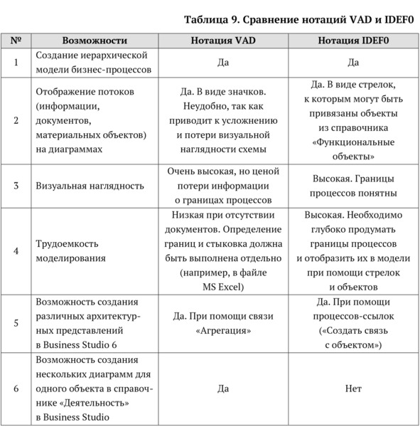 Начиная с версии 6, в Business Studio представлены две нотации для проектирования процессов на верхнем уровне: VAD и IDEF0. Моделировать в VAD можно с использованием встроенного в систему редактора, в IDEF0 – при помощи MS Visio. В 7-й версии Business Studio доступен только встроенный редактор, который поддерживает две рассматриваемые нотации моделирования.