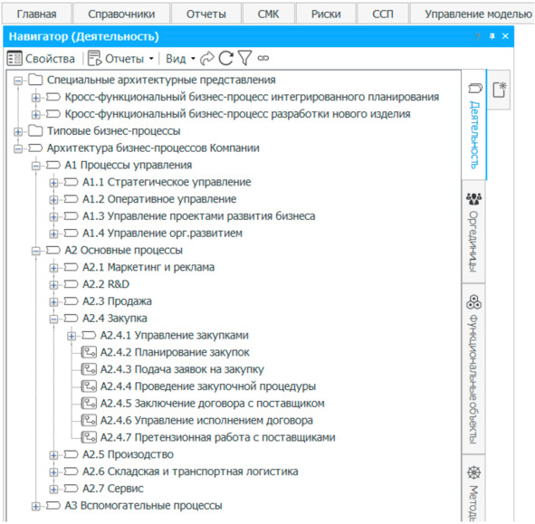 Наличие технической возможности создания различных представлений архитектуры бизнес-процессов и создания нескольких диаграмм для одного объекта иерархического справочника «Деятельность» дают широкие возможности и гибкость в представлении архитектуры и доведении ее до руководителей и работников компании.