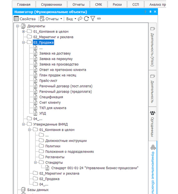 Возможны различные группировки документов по папкам. Если в вашей организации стандартов немного, то можно не усложнять излишне структуру папок по категориям бизнес-процессов, а сделать папки по видам ВНМД или просто использовать одну папку для всех документов. Если же ВНМД много, то для удобства поиска можно создать развитую структуру папок.