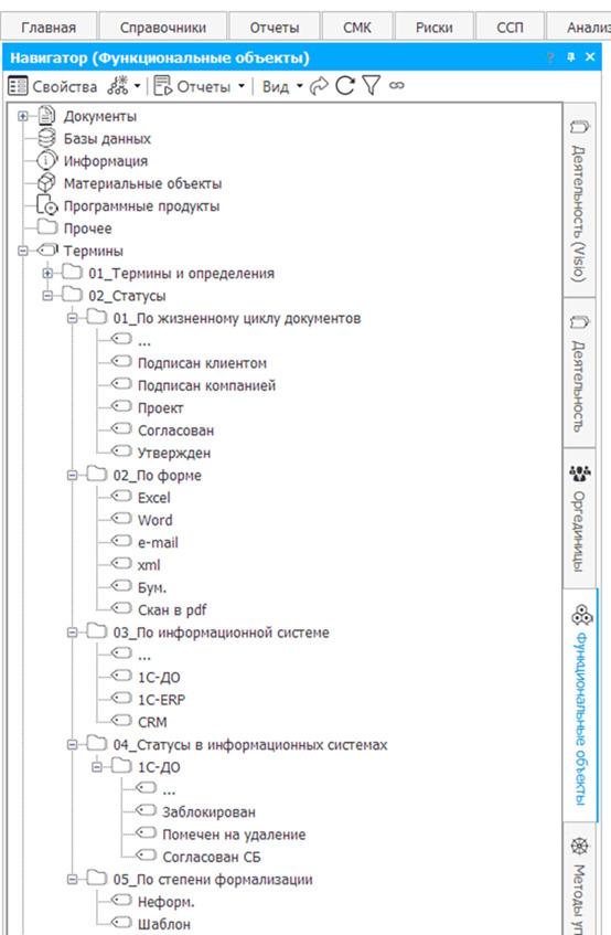 Для создания статусов используется раздел «Термины» в справочнике «Функциональные объекты». Создавать статусы должен процессный методолог. Более того, желательно запретить остальным участникам проекта создавать свои статусы. Иначе через какое-то время в справочнике будет много мусора – неадекватно определенных, ненужных для моделирования статусов.