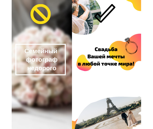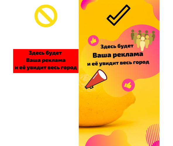 На левой половине иллюстрации – стандартная картинка, которую сделали в моём родном городе. Справа же находится мой вариант, который я сделал за 15 минут. Вы ощущаете разницу? белый фон и разноцветный; похабный «минимализм» (скорее всего лень) и креативное использование фото и иллюстраций; банальное огромное количество свободного места и правильное использование окружения. И подобных «левых» реклам очень много, и вы бы могли этим воспользоваться!