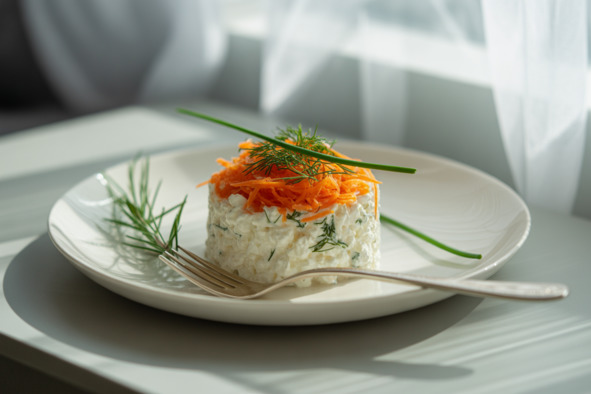 Приготовление: Натри тёплую морковь на мелкой тёрке, соедини с творогом. Добавь мелко нарезанную зелень и сбрызни лимонным соком. Тщательно перемешай до однородности. Этот лёгкий ужин насытит без нагрузки на пищеварение.