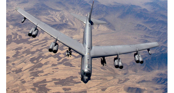 Бомбардировщик В-52, «Стратосферная Крепость» (Boeing B-52 Stratofortress). Экипаж 5 человек, масса снаряженного – 120 тонн, маскимальная взлетная – 220 тонн. Боевая нагрузка 31,5 тонны. Крейсерская скорость 820 км. ч., боевой радиус (туда и обратно) 7200 км. Практический потолок 16 700 м. Оборонительное вооружение – шестиствольная 20 мм. пушка «Вулкан» в хвосте самолета (практически не применялась). С 1952 по 1962 г.г. произведено 744 единицы, некоторое число самолетов стоит на вооружении по сей день.