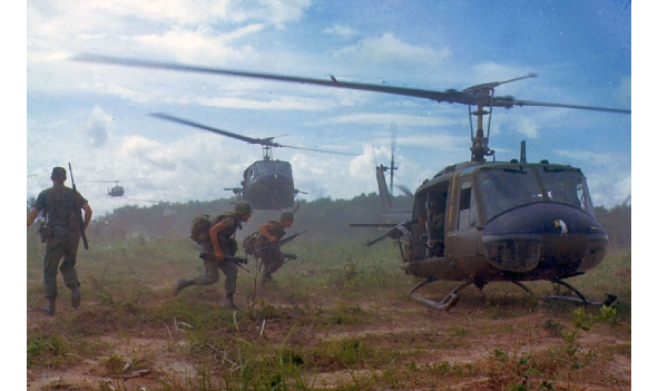 Вертолет «Хьюи» (Huey), Ирокез, иначе Bell UH-1 Iroquois, культовая воздушная машина, символ Вьетнамской войны (на втором месте «Летающий вагон»). Экипаж 1—4 чел, 14 пассажиров, скорость 200 – 270 км. ч, в зависимости от типа двигателя, практическая дальность 510 км., потолок 4100 м. Максимальная взлетная масса 4300 кг. Вооружение подвесное, стрелково-пушечное, управляемые либо не управляемые ракеты. Во Вьетнаме потеряно не менее 4000 машин. С 1956 года построено 16 000 единиц.