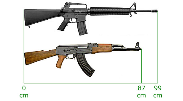 Автоматическая винтовка М-16 (США) и советский автомат АК-47, основное стрелковое вооружение солдат Вьетнамской войны. М-16, семейства AR-15 (торговая марка, стиль оружия) – калибр 5, 56 мм. (длина патрона 45 мм.), масса со снаряженным магазином 3,3 кг., скорострельность 650—950 выстрелов в минуту, в зависимости от модификаций, начальная скорость пули 850—990 м. с. Прицельная дальность 450—850 м. Емкость магазина 20—30 патронов. Перезарядка осуществляется давлением пороховых газов на поршень т.н. «прямого газоотвода», соосного со стволом, находящегося перед патроном (возвратная пружина в прикладе). Гильзы выбрасываются вправо и вперед. С 1960 года по наше время выпущено более 8 млн. экземпляров. Конструктор – Юджин Стоунер. Некоторые нарекания американских военных в ходе испытаний винтовки вызывают ее относительно малый калибр, и не слишком высокая надежность. Однако, так или иначе, переделка М-16 под патрон 7,21 мм. не состоится. Во время испытаний (не в боевых действиях) пехотинцы ставят высшие баллы М-16 за легкость, удобство удержания в руках и малый импульс отдачи. В условиях реальной войны проявляются недостатки: отказы из-за загрязнений (в частности, длинного приемника магазина), попадания воды в ствол со своеобразными нарезками (капиллярность), сравнительно низкое пробивное и запреградное действие. В 1983 году на вооружении морской пехоты США появляется модификация M16A2 с возможностью отсечки «ускоренной» очереди после трех выстрелов (считается излишним, и плохо влияет на мягкость спуска). В гражданском варианте (в оружейных магазинах США, для населения – самообороны и развлекательной стрельбы) М-16 не имеет возможности вести огонь очередями. АК-47. Калибр 7, 62 мм. в классическом варианте, при длине патрона 39 мм, масса со снаряженным магазином 4,3 кг., скорострельность 600 выстрелов в минуту, начальная скорость пули 715 м.с, прицельная дальность 800 м. Магазин рассчитан на 30 патронов (существуют обоймы и с 45-ю патронами). Основание приклада не соосно стволу, как в М-16, находится ниже него на 7 сантиметров. Это несколько снижает точность стрельбы, но на 25% повышает скрытность корпуса стрелка при стрельбе из окопа, и само удобство использования оружия. Поршень газоотвода находится выше ствола, в какой-то мере это также влияет на кучность попаданий, но резко повышает надежность автомата. Вообще, некоторая несбалансированность хода затвора («дребезг») приводит к естественному очищению оружия во время ведения огня. С 1949 г. по наши дни выпущено более 70 млн. единиц. Конструктор – Михаил Калашников. В конструкции автомата нет признаков действительного изобретения или новизны (поворотный затвор, промежуточный патрон, газоотвод известны много ранее): возникающие из-за того проблемы с патентованием в международных масштабах мешают СССР (позже РФ) иметь устойчивый источник прибыли от копирования АК-47 за рубежом. В 1974 году налажено производство АК-74, под «натовский» калибр 5, 56, он же, у нас 5, 45 мм., (длина те же 39 мм.), массой 3, 5 кг., скоростью пули 910 м.с., прицельной дальностью 1000 м. Малокалиберная пуля имеет центр тяжести ближе к «хвосту», потому менее устойчива в полете, при попадании в цель склонна «опрокидываться», следуя далее по очень замысловатой траектории. На практике же все это обозначает большую вероятность гибели «мишени». В то же время, как ни парадоксально, рядовому с