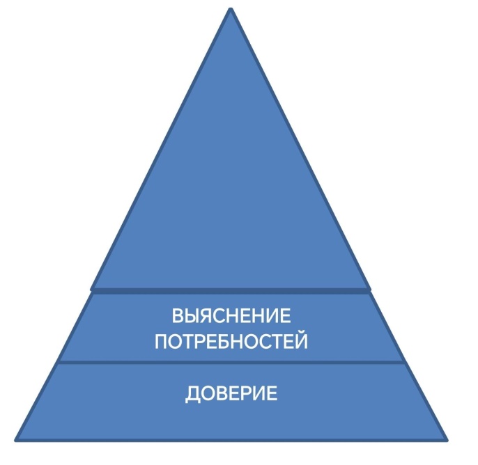 Клиенты бывают разные. Встречаются очень закрытые типы людей, есть клиенты, опасающиеся раскрывать свои истинные мотивы. Другие слишком болтливы, и мы можем просто запутаться в их желаниях и намерениях. Очень важно следовать алгоритму работы с клиентом. Первое – это доверие, и лишь затем – выяснение потребностей. Но не наоборот! Иначе клиент, еще не доверяющий вам как человеку, услышит от вас массу серьезных вопросов, на которые он не готов ответить даже хорошему знакомому (См. рис.3).