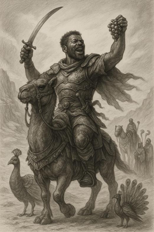 – …и поставил статую. Меня. Прямо в центре площади. На верблюде. Я в доспехах, в одной руке сабля, в другой виноградная гроздь. Сзади – павлин. В броне.