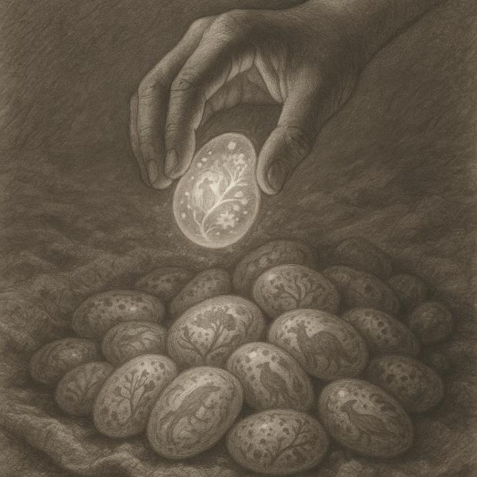 Работа шла методично и по плану. У Аша была куча времени как следует рассмотреть магкамни и заметить, что при похожести на первый взгляд, приглядевшись, становилось очевидным, что все они выглядели по-разному. Их единственной общей чертой был голубая расцветка и такого же оттенка тусклый свет, который они испускали. Но сама их текстура отличалась. Какие-то из них были с волнистыми вкраплениями странной формы, какие-то были покрыты разноцветными точками и пятнами. Ему показалось, что если как следует присмотреться, то можно увидеть в узорах знакомые очертания, где-то напоминающие людей, а где-то различных животных и растения, которые он видел в тех книгах, что Умник заставлял его читать.