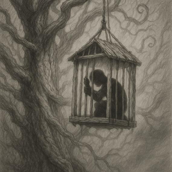 Аш внутри клетки, висящей на огромном дереве в деревянной клетке без дверки. Ребенок пытается выбраться между прутьев, но не пролезает, пытается разогнуть их, но ему не хватает сил. Он кричит, но его никто не слышит. Обычно Аш проводил в подобных кошмарах всю ночь и просыпался потом в поту и ни капли не отдохнувший.