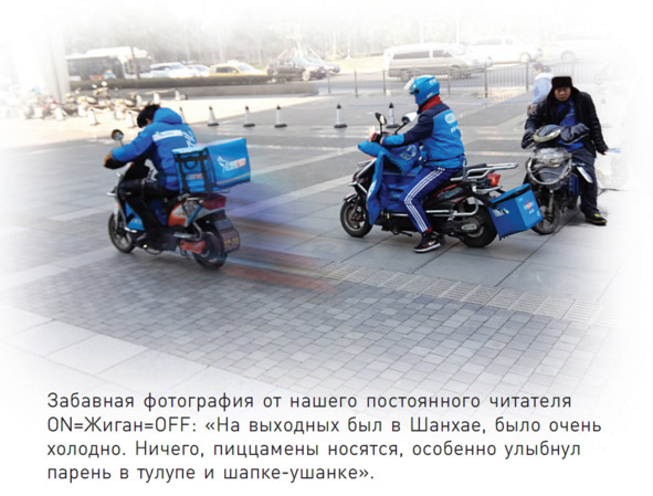 Забавная фотография от нашего постоянного читателя ON=Жиган=OFF: «На выходных был в Шанхае, было очень холодно. Ничего, пиццамены носятся, особенно улыбнул парень в тулупе и шапке-ушанке».