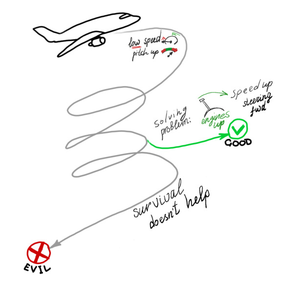 Now imagine that an inexperienced pilot is sitting in the cockpit of an airplane: he knows how to fly correctly, but he is not yet able to recognize in time how the plane goes into a dangerous mode. His feelings have not yet been fixed, and he cannot quickly understand the complex correlations of instrument readings. In this case, when there is a problem with the plane, the pilot remains calm, after all, he is alive, his instincts are silent, and he does not try to survive despite the plane steadily approaching death. Not knowing how death is approaching him, the pilot does not try to overcome the problem. Survival in its purest form does not help.